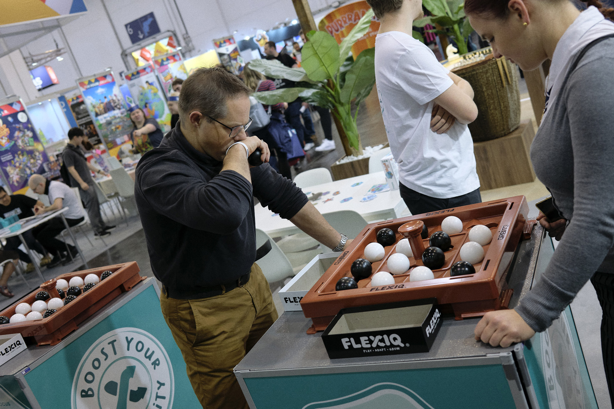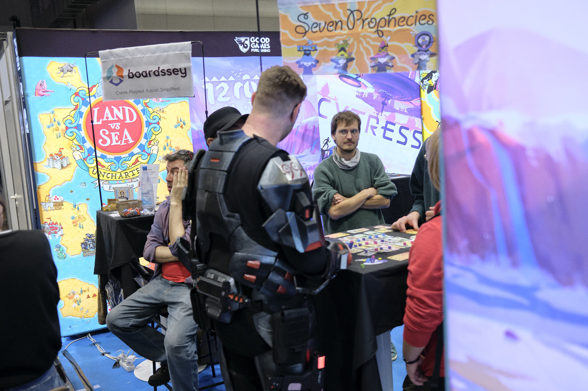 Ich glaube, es ist ein Vorteil, dass ich bei den Themen, die ich mir aussuche, oft Beobachter von außen bin. Ich bin in keinem Verein, keiner Partei – und in diesem Fall: auch in keiner Brettspielgruppe. Zwischendurch spiele ich mal, aber kann wenig mitreden. Da ich Messen gerade interessant finde, bot es sich an, mit Freunden diese zu besuchen und fotografisch etwas zu begleiten. Ich war nach irgendwas auf der Suche, aber eigentlich wollte ich mich überraschen lassen – was beides bedeutet, blieb offen. Lustige Szenen, verkleidete Leute, volle Gänge, müde Aussteller? Was davon hat einen Mehrwert? Ich teile einfach mal ein paar Gedanken, die mir an diesen zwei Tagen durch den Kopf gingen – oder die ich wiedergefunden habe.